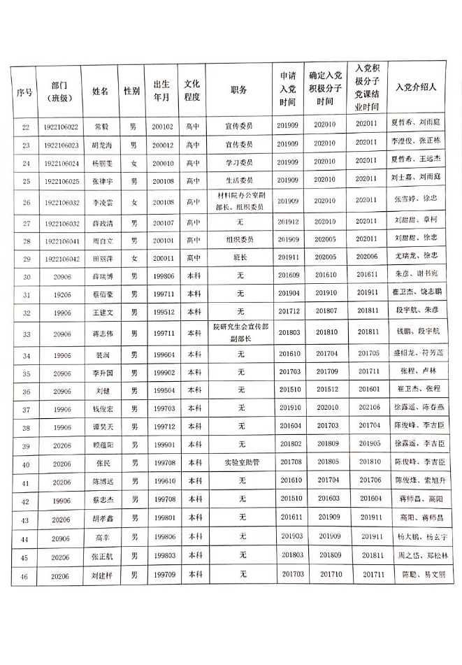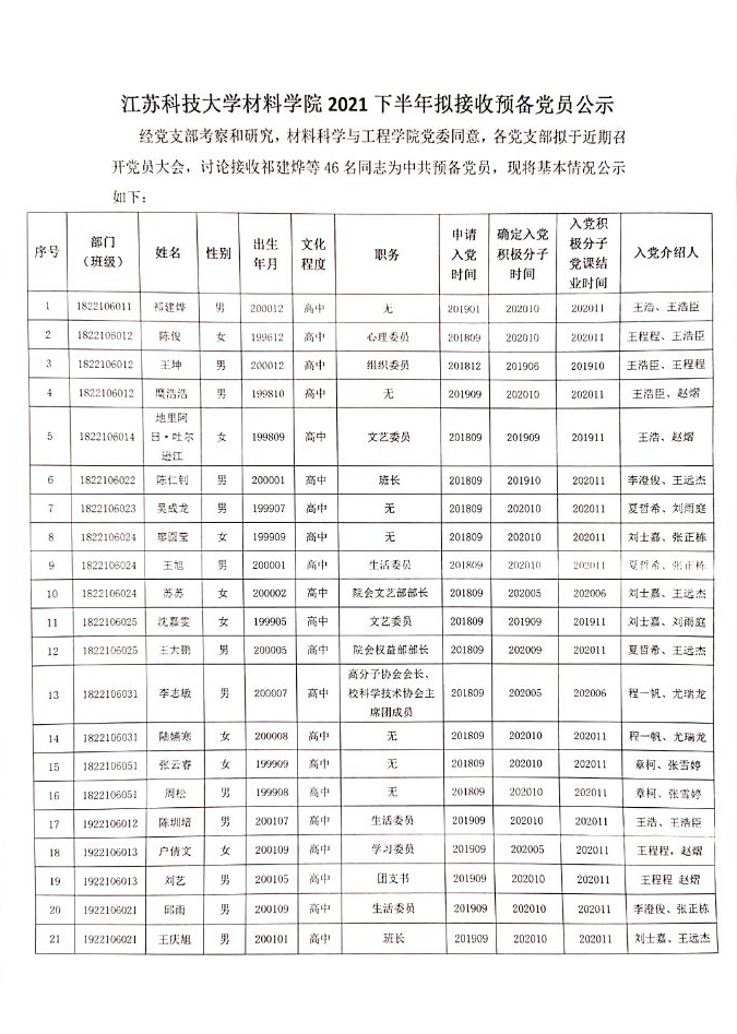 江蘇科技大學材料學院2021下半年擬接收預備黨員公示