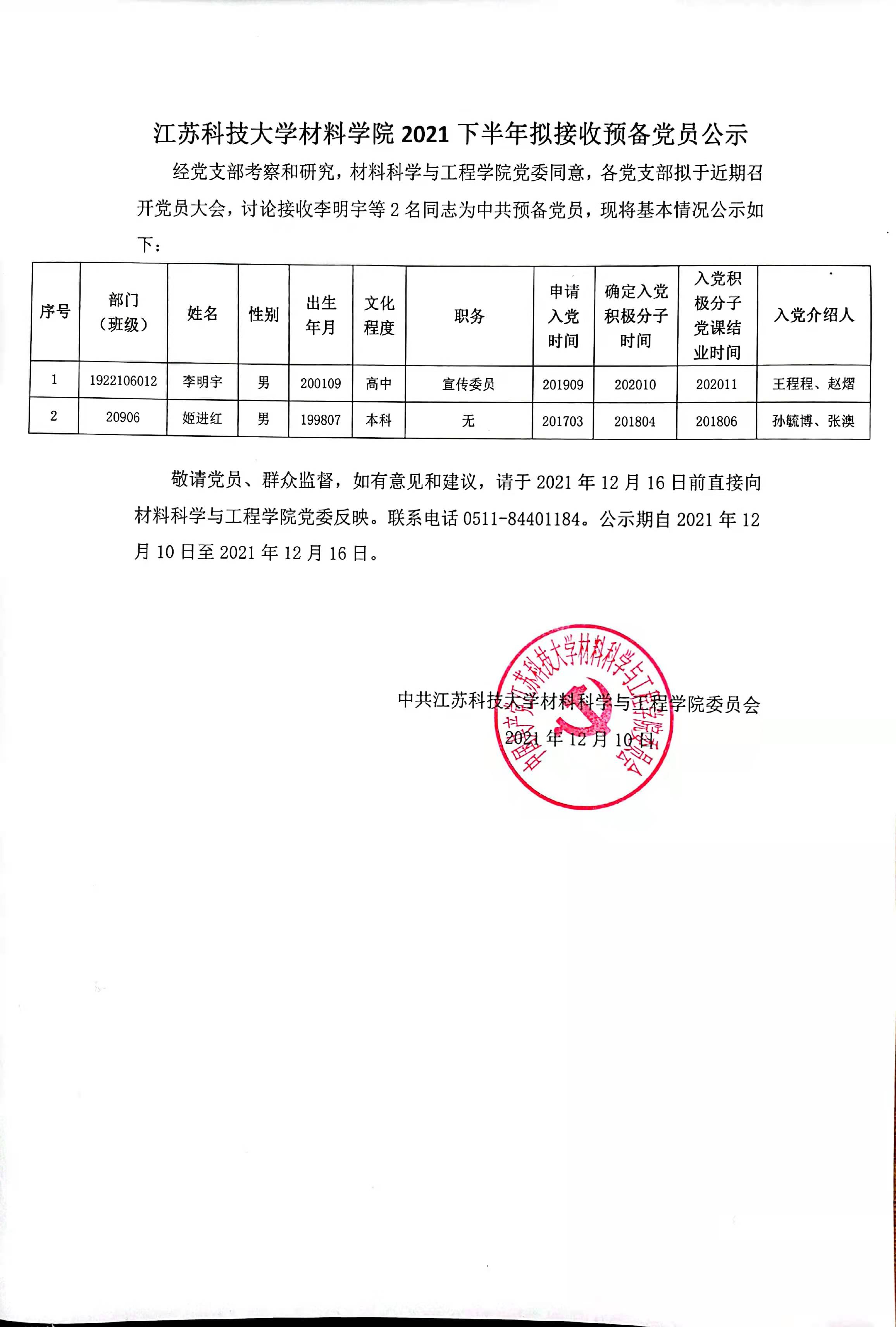 江蘇科技大學材料學院2021下半年擬接收預備黨員公示
