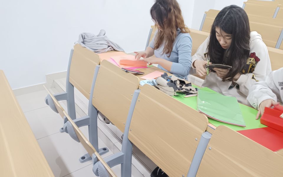 5月10日,作品集體構(gòu)思與制作活動(dòng)在篤學(xué)樓205舉行,同學(xué)們相約在一起開始構(gòu)思作品。同學(xué)們帶著收集好的廢舊品來到教室對(duì)紙箱,礦泉水瓶,廢棄紙張的利用進(jìn)行討論交流并進(jìn)行首次嘗試創(chuàng)作。有提議制作燈籠的,也有動(dòng)手制作象征生命力的椰子樹的,還有制作簡單實(shí)用的垃圾箱的,還有通過塑料瓶和折紙創(chuàng)作出花卉的。各種構(gòu)思的碰撞讓現(xiàn)場(chǎng)的氛圍熱烈起來,同學(xué)們相約第二天帶著足夠的材料,約好自己的好友一同創(chuàng)作。