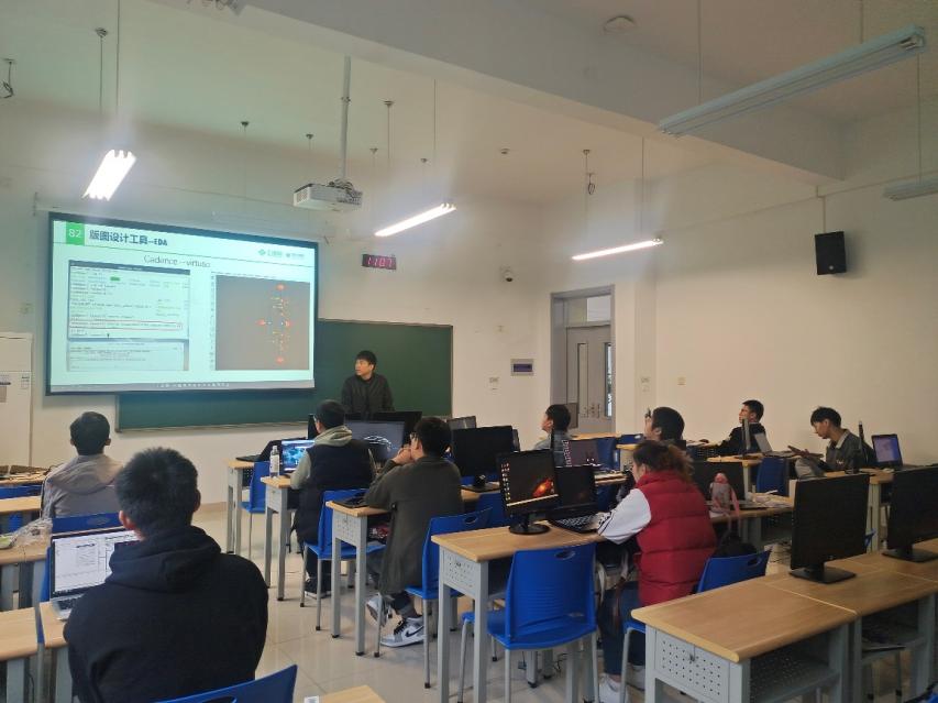 材料學(xué)院副院長王宇鑫為本次實(shí)訓(xùn)班作開幕致辭。他指出,芯片技術(shù)是目前我們國家卡脖子問題之一,學(xué)院重視培養(yǎng)這方面的人才,希望同學(xué)們能夠通過這次實(shí)訓(xùn)對芯片有進(jìn)一步的認(rèn)識。本次實(shí)習(xí)實(shí)訓(xùn)為期五天,主要內(nèi)容涉及IC芯片行業(yè)發(fā)展趨勢和人才需求、軟件操作、EDA工具環(huán)境設(shè)計、cadence版圖設(shè)計工具、擇業(yè)就業(yè)規(guī)劃指導(dǎo)等。