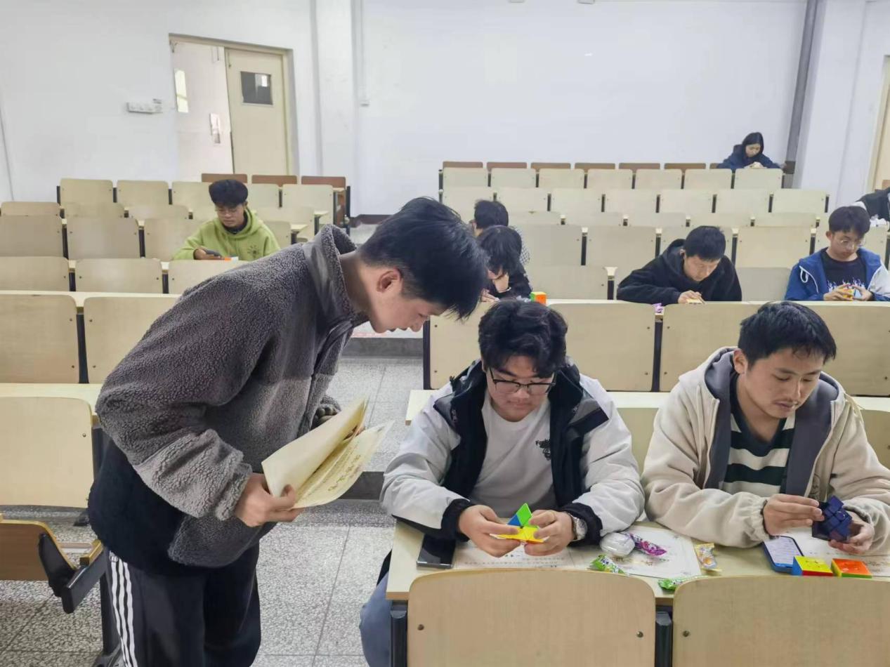 活動中,學長們首先與大一社員交流魔方經(jīng)歷,分享大賽體驗,并通過互動的方式教會大家更深層次的公式理解及訓練方法,幫助社員取得技術(shù)上的突破,也增強社員們的自信以及深入學習的動力。比賽中,選手在裁判的監(jiān)督下復原被打亂的魔方,確認成績后將成績單交由工作人員,過程井然有序、有條不紊。