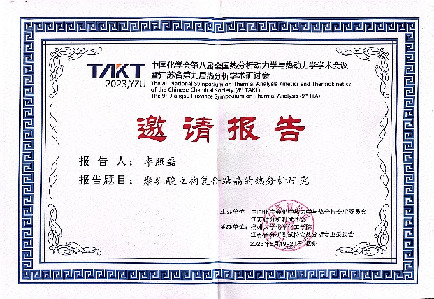 我院李照磊副教授受邀參加了本次會議,并作了題為“聚乳酸立構復合晶的熱分析研究”的大會邀請報告。課題組研究生沈鑫與宋琪同學作了墻報展示,其中沈鑫同學榮獲優(yōu)秀墻報獎(大會共投票產生11名優(yōu)秀墻報獎)。本學術會議是我國熱分析研究與應用領域的頂級會議,通過參會交流,進一步加強了材料學院相關課題組與國內頂尖研究團隊之間的聯(lián)系,提升和增強了我校相關學科在領域內的知名度和影響力。
